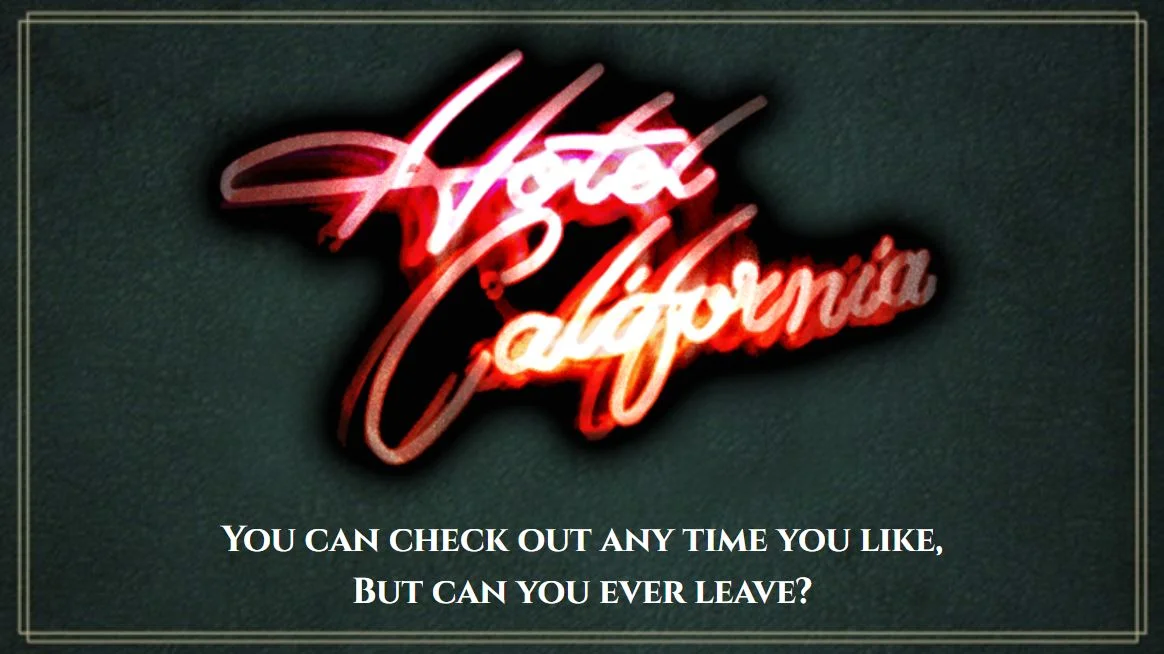 Hotel California is based on the classic Eagles song. The master of the hotel, Tracy Morice fell into madness after his pursuit of the American dream caused him to lose his daughter. He now seeks to trap the starry eyed fools who believe in the American dream by inviting them to his ritzy hotel where they become prisoners of their own device. You can check out anytime you like, but can you ever leave?